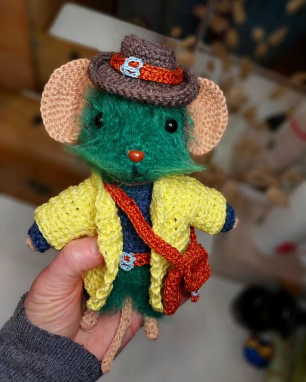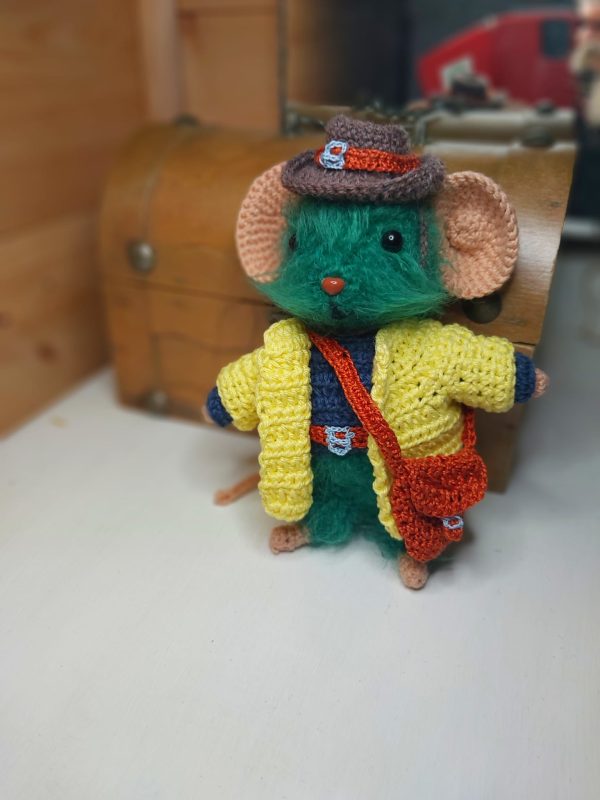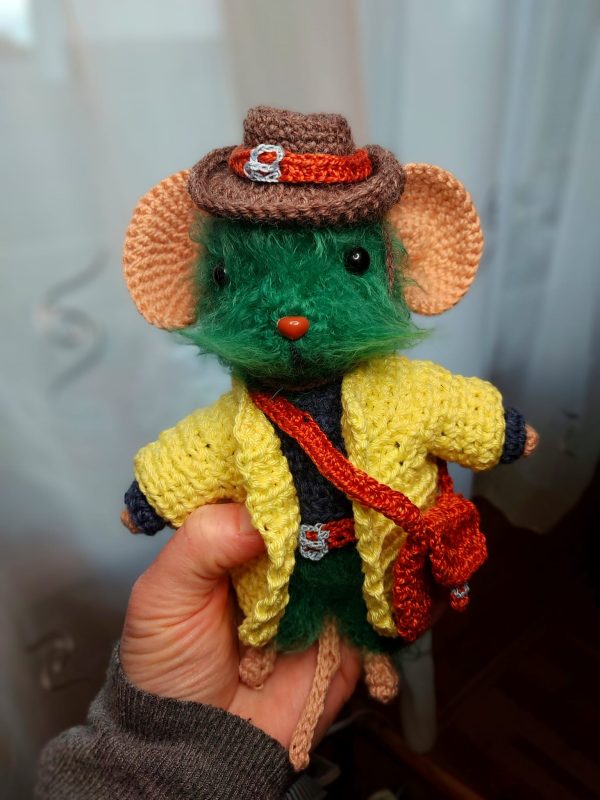 „Szczurek Ogórek”, w swoim szykownym, szydełkowanym kapelusiku i żółtym sweterku, jest gotowy do każdej zabawy i przygody. Jego zielone futerko jest miękkie jak aksamit, a sympatyczne uszka są zawsze gotowe do słuchania dziecinnych tajemnic i marzeń. Wysokość przytulanki to około 30 cm – idealna, aby być przyjacielem na wyciągnięcie ręki.